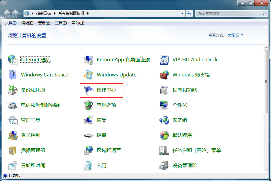 2、在控制面板選項中,點擊“操作中心”選項,如下圖所示: