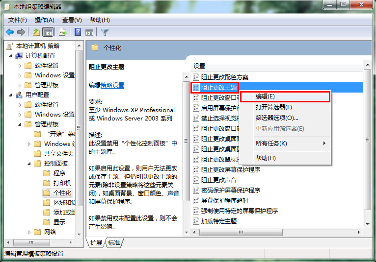 4、從右側(cè)個(gè)性化設(shè)置中找到“阻止更改主題”選項(xiàng),然后選擇菜單欄“編輯”選項(xiàng),如下圖所示: