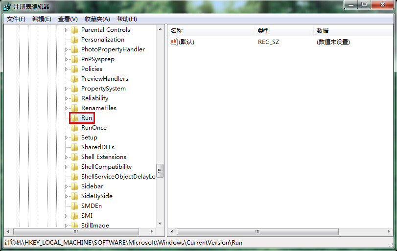 3、打開注冊表編輯器,依次展開“HKEY_LOCAL_MACHINE\SOFTWARE\Microsoft\Windows\CurrentVersion\Run”文件夾,如下圖所示: