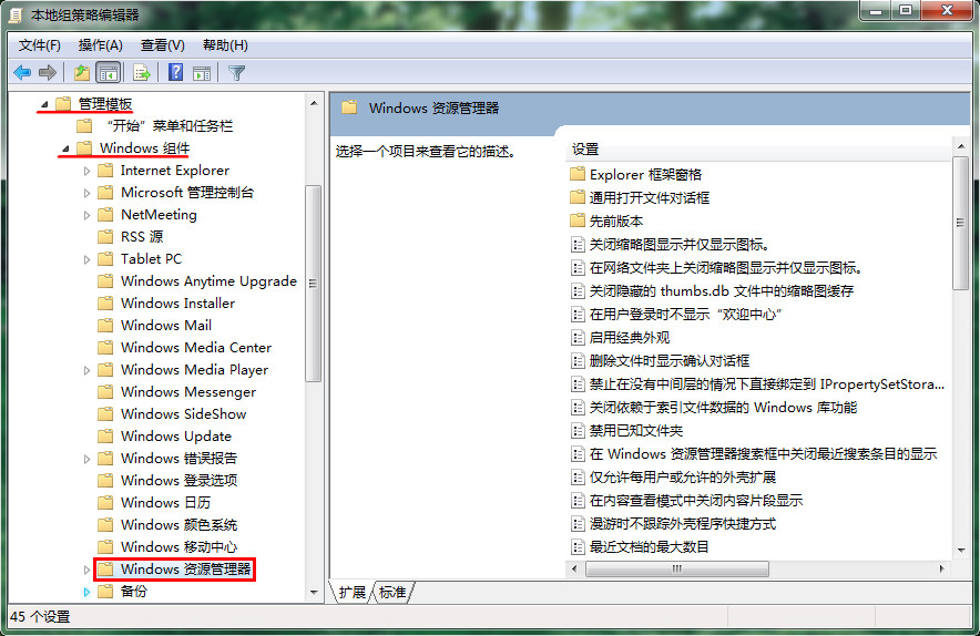 3、進入本地組策略編輯器,依次展開“用戶配置--管理模板--windows組件--windows資源管理器”路徑,如下圖所示: