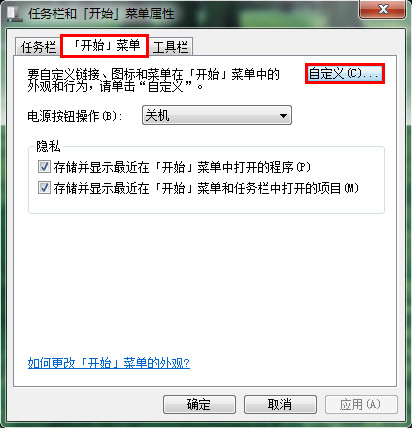 2、打開任務(wù)欄和開始菜單屬性窗口,點擊“開始菜單”選項卡,接著按下“自定義”按鈕,如圖所示: