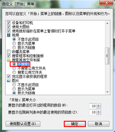 3、從自定義開始菜單欄目中找到“搜索其他文件和庫”選項,勾選“不搜索”,完成后點擊“確定”按鈕,如圖所示: