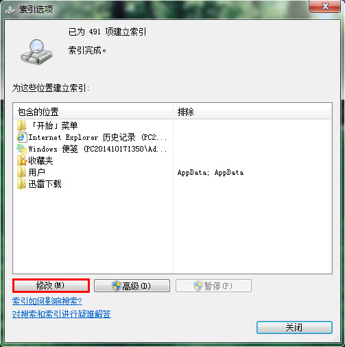 5、可以看到默認索引選項中有著太多沒用的設(shè)置,點擊“修改”按鈕進行自定義,如下圖所示: