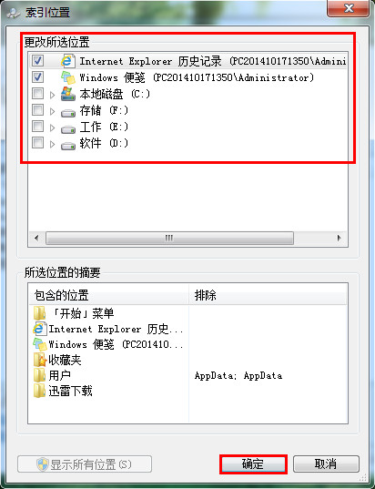 6、依照用戶各自的使用習慣進行修改索引位置,勾選完畢按下“確定”按鈕進行保存,如下圖所示: