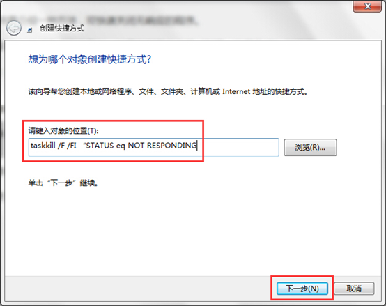 二、接著在創(chuàng)建快捷方式窗口中,在對(duì)象的位置一欄下輸入“taskkill /F /FI “STATUS eq NOT RESPONDING”,點(diǎn)擊“下一步”按鈕,如下圖所示: