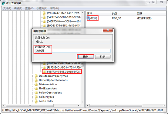 三、接著雙擊打開“默認(rèn)”鍵,把數(shù)值數(shù)據(jù)設(shè)為“回收站”后,點擊“確定”即可。如下圖所示: