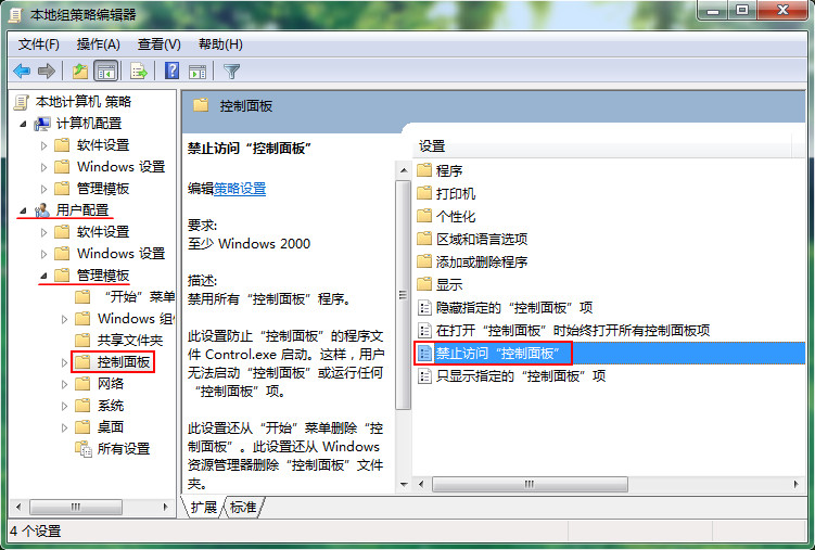 3、進(jìn)入本地組策略編輯器,依次進(jìn)行展開“用戶配置——管理模板——控制面板”文件夾,再從右側(cè)找到并雙擊“禁止訪問控制面板”選項,如圖所示: