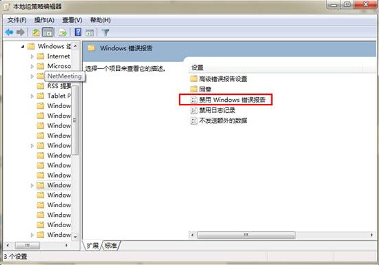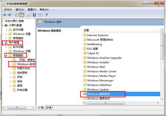 2.打開(kāi)本地組策略編輯器,我們找到“用戶配置”→“管理模板”→“Windows組件”→“Windows錯(cuò)誤報(bào)告”。如下圖所示