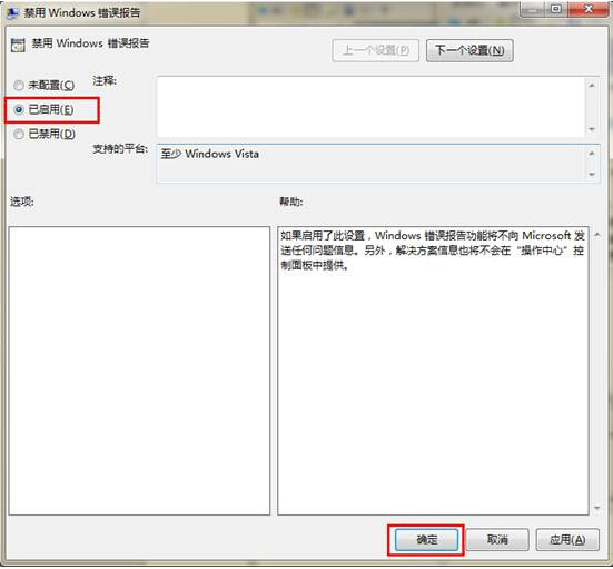 4.在打開(kāi)的禁用Windows錯(cuò)誤報(bào)告窗口中,點(diǎn)擊選擇“已啟用(E)”點(diǎn)擊確定完成操作。如下圖所示