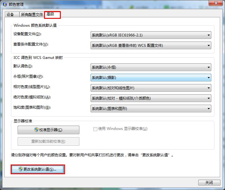 3、彈出顏色管理窗口后,切換到“高級(jí)”標(biāo)簽,然后點(diǎn)擊窗口下方的“更改系統(tǒng)默認(rèn)值”按鈕,如下圖所示: