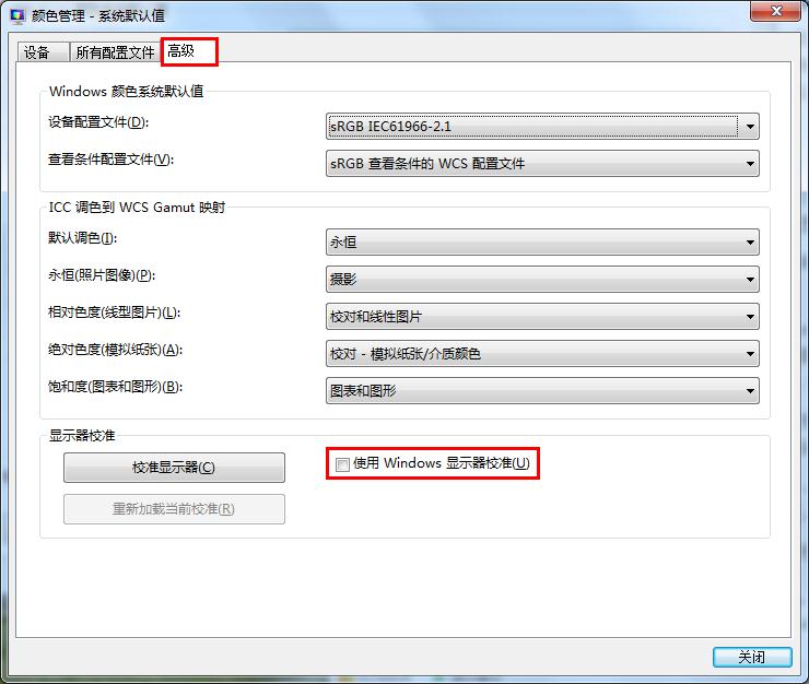 4、進(jìn)入默認(rèn)值設(shè)置窗口后,同樣切換到“高級(jí)”標(biāo)簽下,然后取消系統(tǒng)默認(rèn)勾選的“使用Windows顯示器校準(zhǔn)”,并點(diǎn)擊“關(guān)閉”即可,如下圖所示: