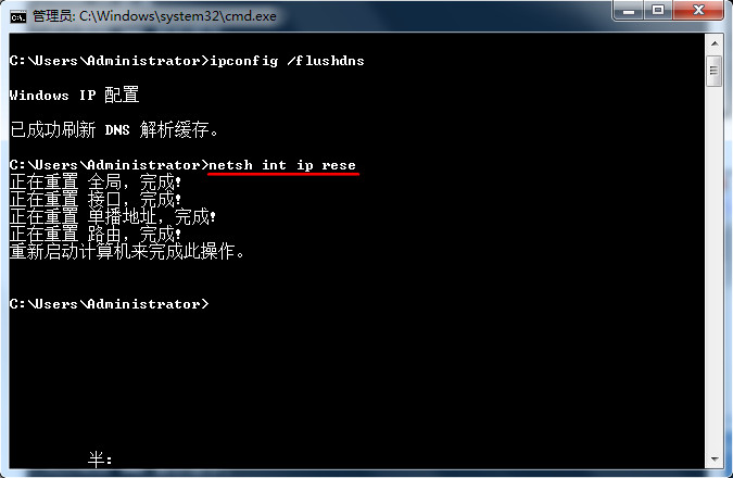 5、繼續(xù)在光標處輸入“netsh int ip rese”指令,按下回車鍵進行重置TCP/IP協(xié)議端口,如下圖所示: