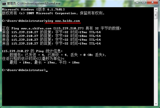 3、給命令窗口中輸入“ping www.baidu.com”指令,按下回車鍵執(zhí)行檢查網(wǎng)速操作,如下圖所示: