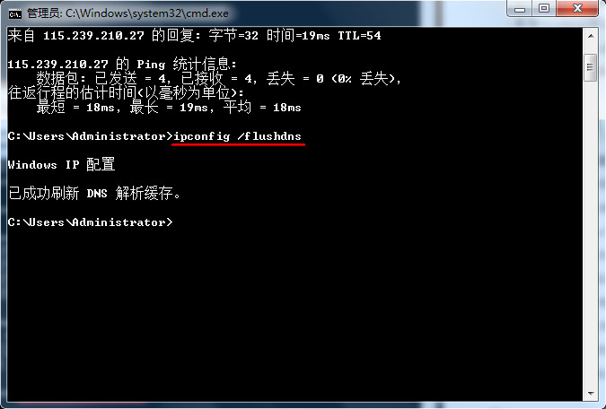 4、在光標處輸入“ipconfig /flushdns”指令,按下回車確認刷新dns緩存,如下圖所示: