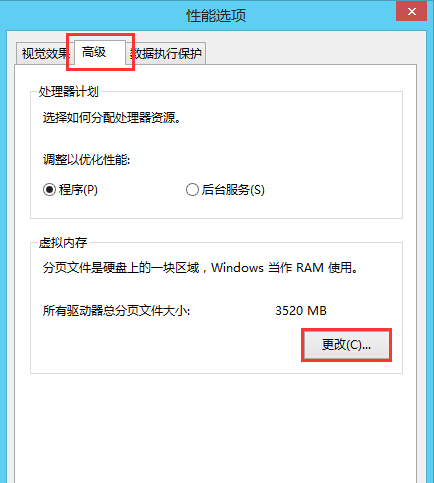3、在性能選項中,點擊“高級--更改”,如圖所示: