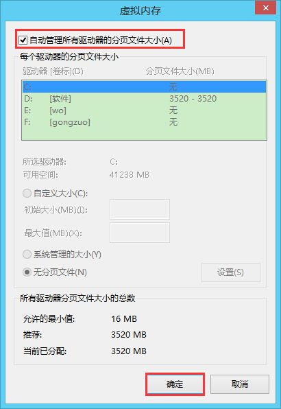 5、重啟電腦,進系統(tǒng)后再次打開虛擬內(nèi)存界面,此時勾選“自動管理所有驅(qū)動器的分頁文件大小”,點擊“確定”即可退出,如圖所示: