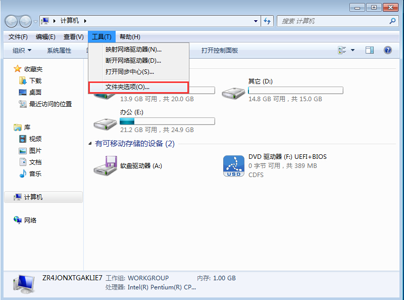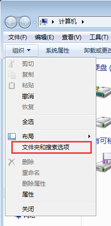 1、首先打開計算機,點擊“工具--文件夾選項”,如果沒有這個選項則點擊“組織--文件夾和搜索選項”,如圖所示: