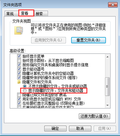 2、在文件夾選項中,點擊“查看”,下拉滑條找到“隱藏文件和文件夾”,選擇勾選“顯示隱藏的文件、文件夾和驅(qū)動器”,如圖所示: