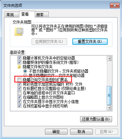 3、如果希望顯示擴展名的還需要將“隱藏已知文件類型的擴展名”前面的勾去掉,如圖所示: