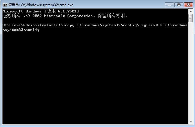 2、在命令窗口輸入c:\>copy c:\windows\system32\config\RegBack*.* c:\windows\system32\config,按回車鍵確定,如圖所示: