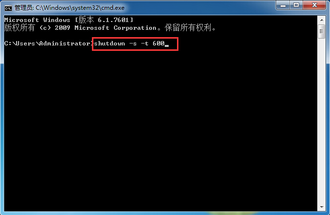 2、在命令提示符窗口中,輸入命令shutdown -s -t xxx,其中xxx為秒數(shù),即關(guān)機倒計時的秒數(shù),比如我們希望10分鐘后定時關(guān)機,就輸入shutdown -s -t 600,按回車鍵確定,如圖所示: