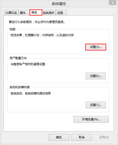 3、在系統(tǒng)屬性中,點(diǎn)擊“高級(jí)--設(shè)置”,如圖所示: