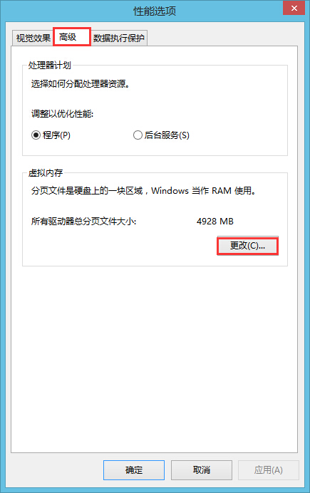4、性能選項(xiàng)中繼續(xù)點(diǎn)擊“高級(jí)--更改”,如圖所示: