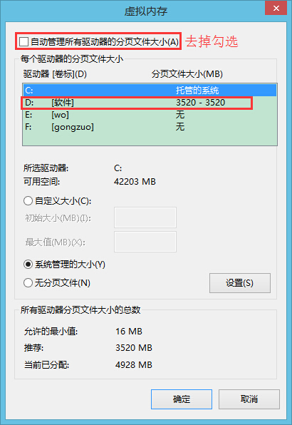 5、進(jìn)入虛擬內(nèi)存界面,我們先將自動(dòng)管理所有驅(qū)動(dòng)器的分頁(yè)文件大小前面的勾去掉,然后點(diǎn)擊空間較大的非系統(tǒng)盤(pán),如圖所示: