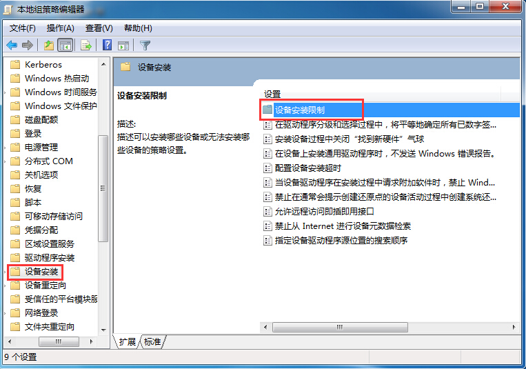 2、在本地組策略窗口中,依次打開“計(jì)算機(jī)配置-管理模板-系統(tǒng)-設(shè)備安裝”,在右側(cè)列表中找到“設(shè)備安裝限制”選項(xiàng),如圖所示: