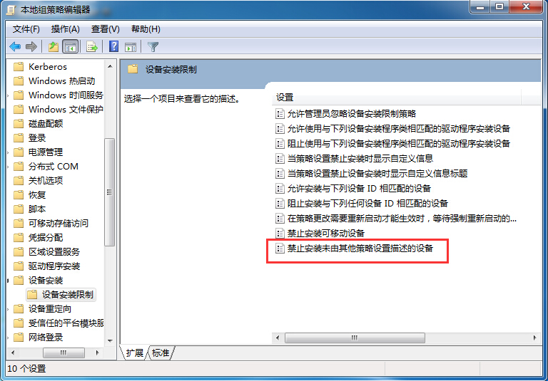 3、雙擊打開“設(shè)備安裝限制”,在里面找到“禁止安裝未由其他策略設(shè)置描述的設(shè)備”,同樣雙擊將其打開,如圖所示: