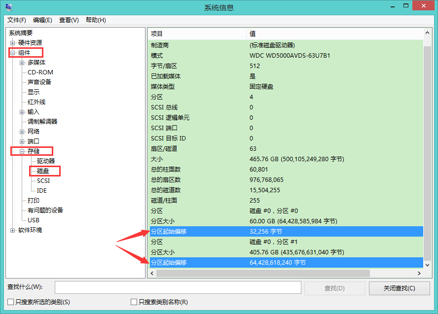 2、隨后彈出系統(tǒng)信息窗口,我們?cè)谧髠?cè)點(diǎn)擊“組件--存儲(chǔ)--磁盤”,然后在列表右側(cè)找到“分區(qū)起始偏移”,將其后的數(shù)值分別除以4096,如果得出的數(shù)為整數(shù)則說(shuō)明已經(jīng)4K對(duì)齊了,如果不是整數(shù)則表明該硬盤位進(jìn)行4K對(duì)齊,如圖所示: