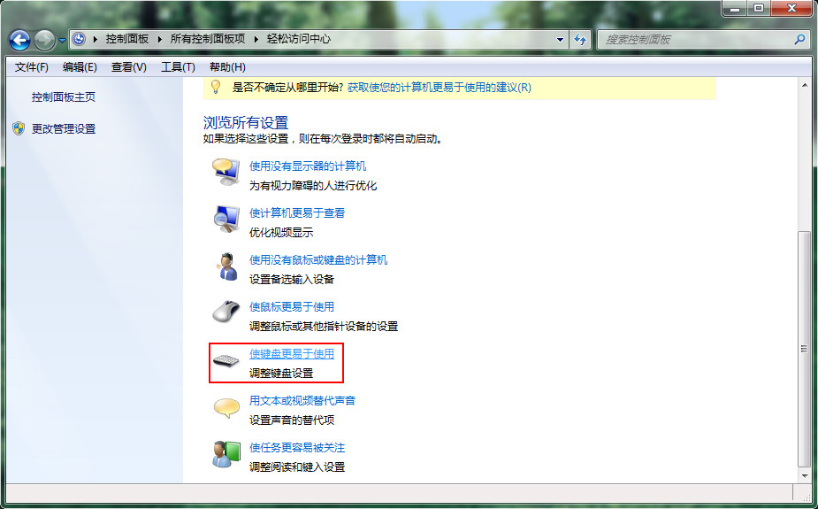 3、打開輕松訪問中心界面,點擊“使鍵盤更易于使用”進入設(shè)置,如下圖所示: