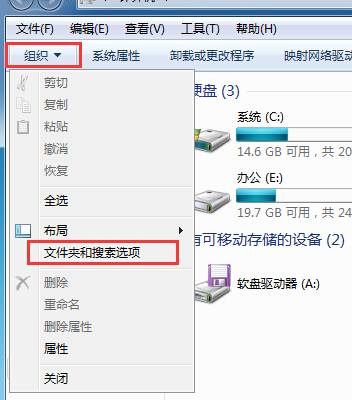 1、在桌面上打開“計(jì)算機(jī)”,進(jìn)入后點(diǎn)擊“組織--文件夾和搜索選項(xiàng)”,如圖所示: