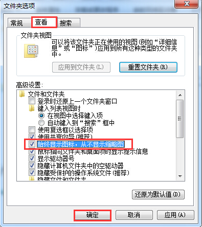2、在彈出的窗口中,點(diǎn)擊“查看”選項(xiàng)卡,在高級(jí)設(shè)置下方找到“始終顯示圖標(biāo),從不顯示縮略圖”,將其勾選即可,最后點(diǎn)擊確定,如圖所示: